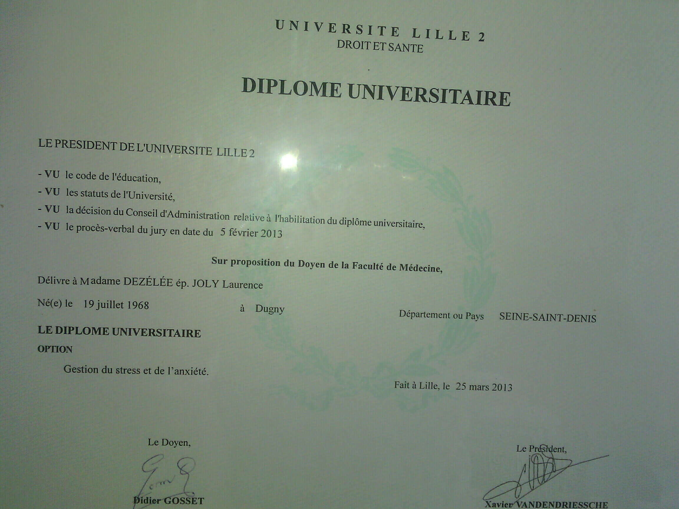 - J’ai obtenu un D.U en gestion du stress et de l’anxiété à la faculté de médecine de Lille 2, sous la direction du Dr Dominique Servant. (2012)